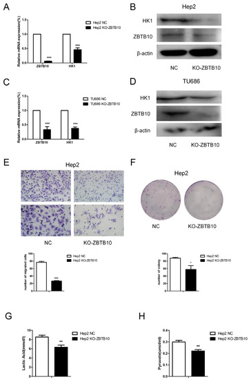 ZBTB10 binds to a candidate promoter sequence in HK1 and transcriptionally regulates HK1 gene expression. (A) Representative immunoblot analysis of HK1, ZBTB10 and HA protein expression in ZBTB10-overexpressing cells. (B) Representative immunoblot analysis of HK1 and ZBTB10 protein expression in ZBTB10 knockout cells. (C) Luciferase activity of HK1 in ZBTB10-overexpressing 293T cells. (D) Luciferase activity of HK1 in ZBTB10 knockout 293T cells. (E,F) Luciferase activity of HK1 in ZBTB10-overexpressing and ZBTB10 knockout Hep2 cells. (G) Fold enrichment of the positive control RPL30 in the ChIP assay. (H) Fold enrichment of HK1 in the ChIP assay. * p < 0.05; ** p < 0.01; *** p < 0.001.