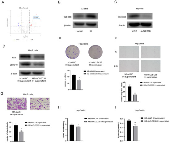 CLEC3B level of M2 supernatant is significantly higher in IH group and showed protumor effect on Hep2 cells. (A) Volcano plot displaying proteomics data. (B) The results of Western blotting confirmed CLEC3B in M2 cells. (C) Representative immunoblot analysis of CLEC3B protein expression in shNC or shCLEC3B M2 cells. (D) Representative immunoblot analysis of HK1 and ZBTB10 of Hep2 cells under M2-shNC supernatant or M2-shCLEC3B supernatant treatment. (E) Colony formation assay. (F) Wound-healing assay (100×). (G) Transwell migration assay (100×). (H,I) Lactate and pyruvate assays. The data are presented as the mean ± SD values. * p < 0.05; ** p < 0.01.