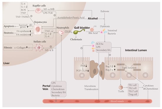 The intestinal flora is closely linked to the liver through the gut–liver axis. After ingestion of alcohol, the unmetabolized portion and acetaldehyde and acetic acid enter the intestine, disturbing the ecological stability of the intestinal lumen and causing disproportionality in the composition of the bacterial flora, such as an elevated Firmicutes/Bacteroidetes ratio, and metabolic disorders. The decrease in FXR gene expression and FGF-19 synthesis by intestinal wall cells, which have protective effects, promoted apoptosis of intestinal wall cells on the one hand, and the decrease in FGF-19 entering the liver, on the other hand, led to the impaired metabolism of bile acids, resulting in fatty infiltration of the liver and steatosis of hepatocytes. In turn, toxic products such as LPS leaking through the intestinal wall activate immune cells, leading to the secretion of large amounts of inflammatory factors that attack the tight junction and hepatocytes, leading to more severe weakening of the intestinal wall barrier and hepatocyte death. Activated neutrophils exacerbate the inflammatory response and attack bile duct cells, causing cholestasis and exacerbating the lesions.