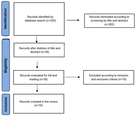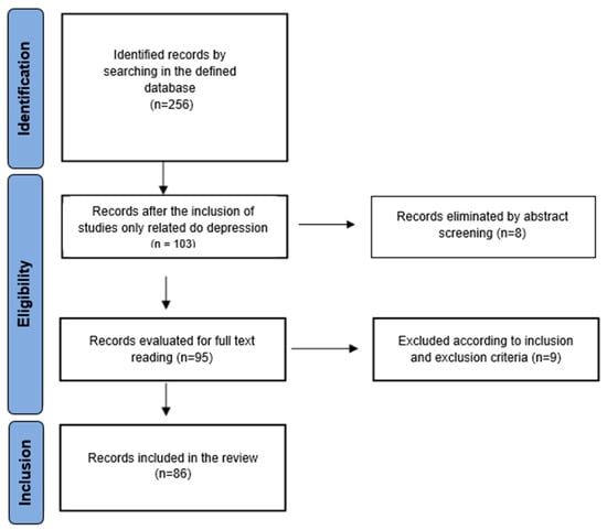The PRISMA flow diagram was used to collect and filter the information. Initially, a total of 256 articles were obtained from the described database. After discarding in accordance with inclusion criterion 1 (studies focused on BDNF and depression), 103 studies were selected for abstract screening, with 95 studies being selected for full-text reading. For this purpose, all the studies were divided equally and randomly. Doubts and disagreements were resolved by discussion, and the final selection was made by consensus. Of the total, 81 studies were included in the systematic review (Figure 1). In relation to the second search, a total of 320 articles were initially obtained. Subsequently, they were screened by title, and 38 studies were selected for reading of the full text, with 19 studies being included in the systematic review (Figure 2).