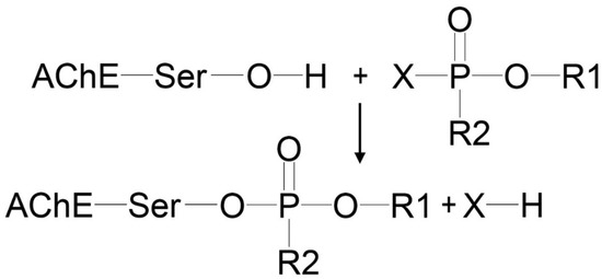 Organophosphates (OPs) are widely used in agriculture and industry as pesticides, insecticides, plasticizers and flame retardants, polymeric materials, and components in the synthesis of drugs [1]. The toxic mechanism of OPs is mainly due to the irreversible inhibition of acetylcholinesterase (AChE, EC 3.1.1.7) of neuromuscular and neuronal synapses via covalent bond formation with catalytic Ser203 [2] (Figure 1).