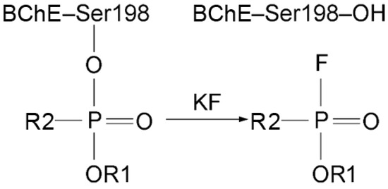 The limitations of modified AChE as a biomarker of OP poisoning are its relatively low concentration in plasma (0.5 μg/mL) and the difficulty of extracting it from erythrocyte membranes for analytical studies. BChE is freely available in serum/plasma at higher concentrations (5 µg/mL), making BChE a more suitable diagnostic biomarker. According to Degenhardt et al. [14], analysis is possible even if only 1% of BChE is inhibited. OPs react with albumin sites of modification at least 500 times slower than with ChE active sites [15,16]. However, the concentration of HSA in the blood is four orders of magnitude higher than that of BChE, so modified HSA is also used as a biomarker of OP exposure. Therefore, the main objects of the studies in the analytical toxicology of OPs are HSA and BChE. One of the methods for establishing OP poisoning is the reactivation of modified BChE using a concentrated solution of KF in an acidic medium (pH 3.5) [16,17,18,19,20]. As the result of the reaction of KF with the modified catalytic serine, OPs or their fluoroanhydrides are formed and are available for analysis. The scheme of BChE reactivation is shown in Figure 2. OPs or their fluoroanhydrides can be released not only from the adducts with BChE but also from the adducts with albumin, though some organophosphorus adducts on HSA could not be detected by fluoride exposure [21].