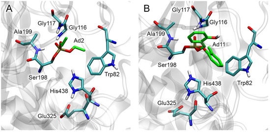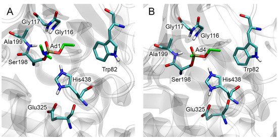 Structures of adducts Ad1 ((A), protein databank (PDB) entry 3djy [33], accessed on 1 September 2023) and Ad4 ((B), PDB entry 2xqk [34], accessed on 1 September 2023) according to X-ray analysis. Ser198, His438, and Glu325 form the catalytic triad. Trp82 is a part of the anionic center in which the ammonium cationic groups of substrates and inhibitors bind. Gly116, Gly117, and Ala199 form the oxyanion center, which is the binding site for the carboxylic oxygen of substrates and the phosphoryl oxygen of OPs. Hydrogen atoms (not resolved by X-ray) were completed by us with the help of the Visual Molecular Dynamics v.1.9.4a53 program (VMD, University of Illinois Urbana-Champaign, USA) [35]. His438 was assigned as double protonated. Carbon atoms of the organophosphorus moiety are highlighted in green. Nonessential hydrogens are omitted for clarity.
