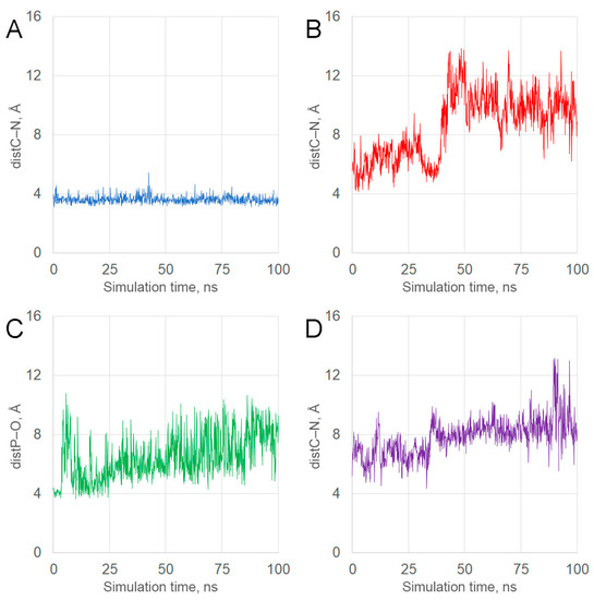 Time dependence of the distance between the functionally significant atoms in the CBDP complexes with HSA according to MD simulation. (A) distance between the carbon atom of the methylene group of CBDP and atom Nε of His242 (distC–N); (B) distance between the carbon atom of the methylene group of CBDP and atom Nζ of Lys351 (distC–N); (C) distance between the phosphorus atom of CBDP and the oxygen atom of the hydroxyl group of Tyr411 (distP–O); (D) distance between the carbon atom of the methylene group of CBDP and atom Nζ of Lys414 (distC–N).