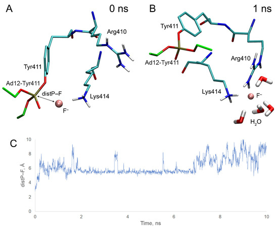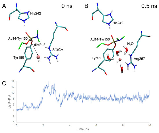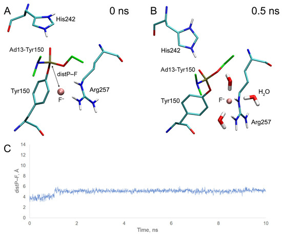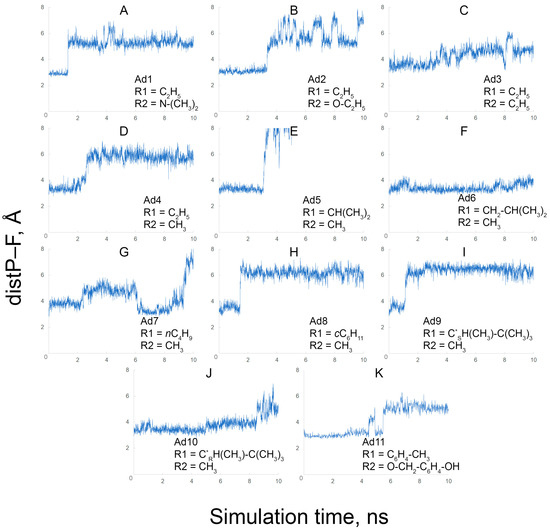 Using MD simulation, we studied the stability of the position of the fluoride ion in the active site of inhibited BChE. Using the obtained trajectories, the time dependence of the distance between the fluoride ion and the phosphorus atom of the adducts (distP–F) was plotted (Figure 10).