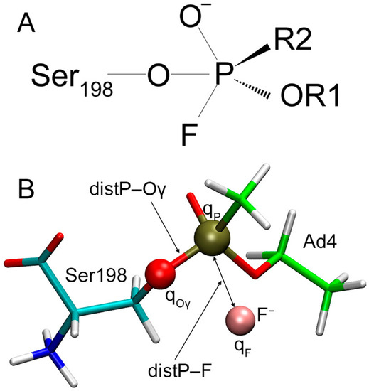 The possibility of reactivation of inhibited Ser198 depends on the strength of bond P–Oγ and the ease of formation of new bond P–F. It is logical to assume that the stronger the fluorine ion is hydrated, the harder it forms a new covalent bond with the phosphorus atom of the adduct. Thus, in the very first approximation, based only on the degree of hydration of the fluoride ion, it is possible to divide adducts into three groups of relatively easy (Ad1 and Ad2), moderate (Ad3–Ad7 and Ad10–Ad11), and weak (Ad8 and Ad9) ability to be reactivated with fluoride ion.