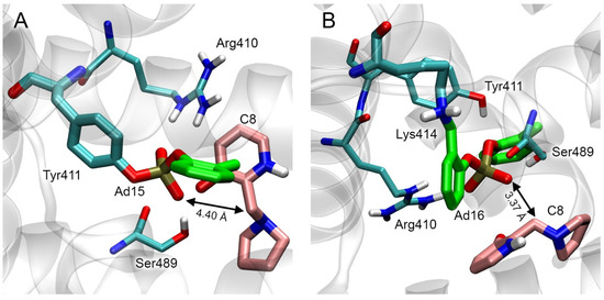 The position of CBDP near Tyr411 is stable for a part of the simulation. During the first 4 ns of the simulation, the distance between the phosphorus atom of CBDP and the hydroxyl oxygen atom of Tyr411 does not exceed 4 Å, but then the ligand molecule moves away from the tyrosine (Figure 6C). In the productive conformation, the molecule of CBDP is fixed by the hydrogen bond between the phosphoryl oxygen atom of the ligand and the hydrogen atom of the hydroxyl group of Tyr411, as well as by pi–cation interaction between the guanidine group of Arg410 and the aromatic ring of CBDP. The proximity of CBDP and Tyr411 allows the nucleophilic attack of the tyrosine hydroxyl on the phosphorus atom of CBDP (Figure 7C).
