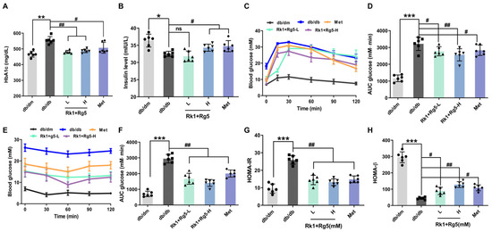 Furthermore, the insulin resistance index (HOMA-IR) and the index of homeostasis model assessment β (HOMA-β) were used to evaluate insulin resistance and β cells’ secretion function, respectively [22,23]. Rk1+Rg5-L and Rk1+Rg5-H decreased the HOMA-IR index by 45.93% and 52.85% of db/db mice and increased the HOMA-β index by 51.1% and 65.85%, respectively (Figure 3G,H, p < 0.05).