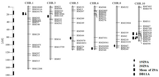 A linkage map of the BC4F5 population was constructed using 129 SSRs following Hu et al. [32]. The map spanned 1414.49 centiMorgan (cM) of the 12 rice chromosomes, with an average distance of 10.96 cM between adjacent markers. The linkage map was constructed using Mapmaker/Exp 3.0 software. Distances between markers were estimated using the Kosambi function and presented in cM. QTL analysis was conducted with QTL IciMapping 4.2 using inclusive composite interval mapping of additive (ICIM-ADD). The mapping parameters were fulfilled at the default option of 1.0 cM scanning steps, and 0.01 probability was used in the stepwise regression for additive QTL identification. QTL were verified by a threshold of logarithm of the odds (LOD) scores (2.87–3.32) compared to the threshold calculated from 1000 permutations for p < 0.05. Therefore, the marginal threshold for a LOD value more than 2.8 was claimed for the putative QTLs. The analysis encompassed LOD value ranges, as well as additive and phenotypic contributions of each QTL.