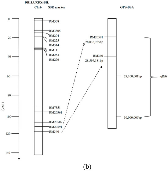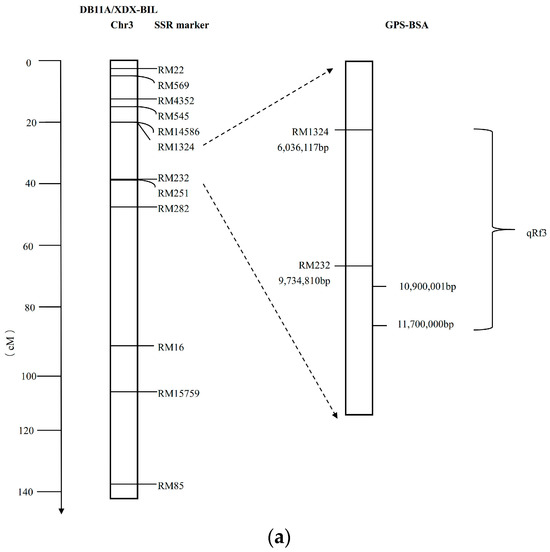 A total of 368 molecular markers were used to detect the polymorphism between the parents XB and “Dongxiang wild rice”. Electrophoretic analysis revealed 129 polymorphic SSR markers, representing a 35.1% polymorphism rate between the two parents. These markers were applied for genotyping the XDX-BIL population and subsequent data recording (Figures S2 and S3). Locating the physical positions of the flanked markers of the qRf3, qRf5, and qRf6 were conducted using the Gramene website [https://www.gramene.org/ (accessed on 27 September 2023)]. The knowing of whether the flanked intervals of the QTL detected by QTL mapping in alignment with the candidate intervals identified by GPS-BSA was analyzed on the overlapping intervals on chromosomes 3 and 6. For chromosome 3, the fertility restoration locus pinpointed a physical position from 6,036,117 bp to 11,700,000 bp. Therein, qRf3 ranged from 6,036,117 bp to 9,734,810 bp by the QTL mapping, while being from 10,900,001 bp to 11,700,000 bp by GPS-BSA. Regarding chromosome 6, the fertility restoration locus occupied the interval from 28,016,785 bp to 31,247,556 bp, which was localized by the QTL result analysis to the 28,016,785 bp to 28,599,181 bp range. However, association GPS-BSA analysis located it within the interval from 29,100,001 bp to 31,247,556 bp.