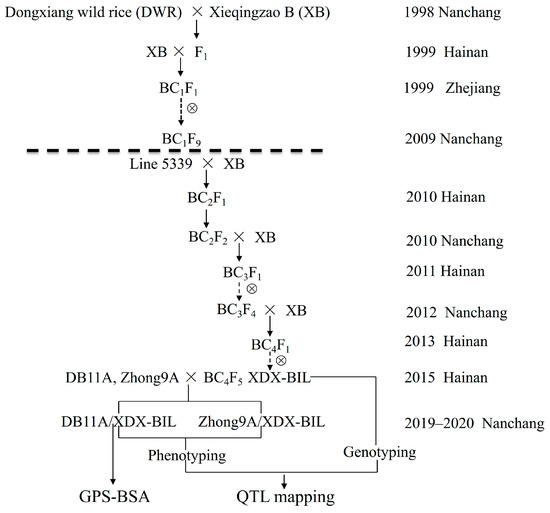 The BC1F10 backcross inbred lines (BILs) were established by first crossing an accession of Dongxiang wild rice (Oryza rufipogon Griff., hereafter referred to as DWR) as the female parent with cultivated Xieqingzao B (hereinafter referred to as “XB”) to generate an F1 hybrid in 1998 by the Rice Research Institute, Jiangxi Academy of Agricultural Sciences (RRI, JAAS), Nanchang, China. The recurrent parent XB is the maintainer line of Xieqingzao A belonging to dwarf-wild-abortive-type CMS (O. sativa L.), and the donor parent DWR is a common wild rice accession collected from in situ conservation populations, which is distributed in northern regions worldwide. Following this, the F1 plants were backcrossed to XB to generate a BC1F1 cross of XB//DWR/XB (hereafter referred to as XDX), from which a BIL population of BC1F10 lines was obtained by single seed descent in 2008 (Figure 5). Our laboratory selected L5339 from the BC1F10 XB/DWR/XB BILs based on the results of phenotypic investigation and molecular marker screening in 2009. The single plant, after backcrossing with XB for three times and self-crossing for four times, obtained a stable genetic (XB//DWR/XB) BC4F5 population (hereafter referred to as XDX-BIL) in Hainan in 2015 by the Rice Research Institute, Jiangxi Academy of Agricultural Sciences (RRI, JAAS), Nanchang, China (Figure 5).