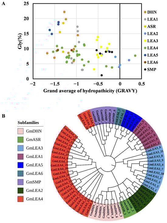Characterization of proteins and phylogenetic evolutionary relationship of GmLEA proteins. (A) Plot of grand average of hydropathicity (GRAVY) and glycine content (%) in each GmLEA protein. (B) Phylogenetic evolutionary relationship of GmLEAs. The phylogenetic tree was constructed from 74 GmLEA members with the neighbor-joining method using MEGA 11.