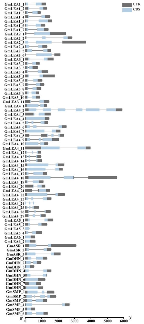 Gene structures of GmLEAs. The blue boxes represented exons and the black line represented intron. The gray boxes represented the UTRs. The scale at the bottom showed the exon sizes.