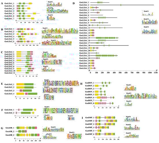 Conserved motif patterns of GmLEAs. Conserved motifs were identified using MEME tools. Three predicted motifs were represented by distinct colored boxes and the grey lines indicated non-conserved regions. (A) GmLEA_1 subfamily; (B) GmLEA_2 subfamily; (C) GmLEA_3 subfamily; (D) GmLEA_4 subfamily; (E) GmLEA_5 subfamily; (F) GmLEA_6 subfamily; (G) GmSMP subfamily; (H) GmASR subfamily; and (I) GmDHN subfamily. Green box: Motif 1; Yellow box: Motif 2; Red box: Motif 3.