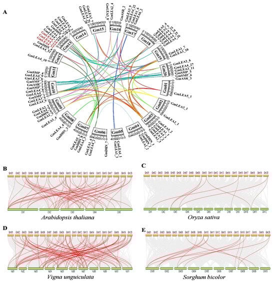 Genomic distribution and synteny analysis of GmLEA family members. (A) Genomic distribution and schematic representations for the interchromosomal relationships of 74 GmLEA genes across 20 soybean chromosomes. The scale on the circle is in megabases. The numbers of each chromosome are shown inside the circle. The WGD or segmental duplication genes are connected with a line. The colored lines indicate the collinear gene pairs within intrachromosomal and interchromosomal, respectively. (B) Glycine max vs. Arabidopsis thaliana; (C) Glycine max vs. Oryza sativa; (D) Glycine max vs. Vigna unguiculata; and (E) Glycine max vs. Sorghum bicolor. Each horizontal line represents a chromosome. Gray lines in the background indicate the collinear blocks with G.max and other four plant species, while the red lines represent the syntenic LEA gene pairs. The number represents the corresponding chromosome name.