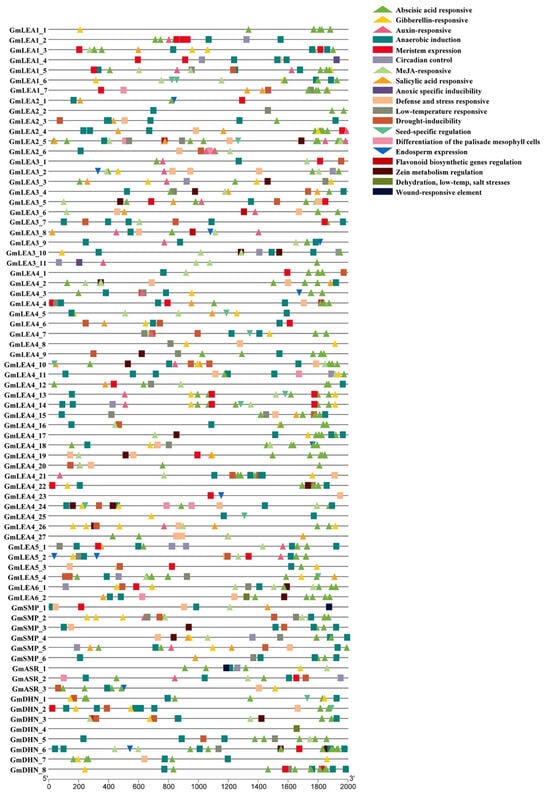 Cis-acting elements in the promoter region of the soybean LEA genes. The 2000 bp promoter region upstream of the gene was analyzed. Different colored boxes represent different cis-acting elements.