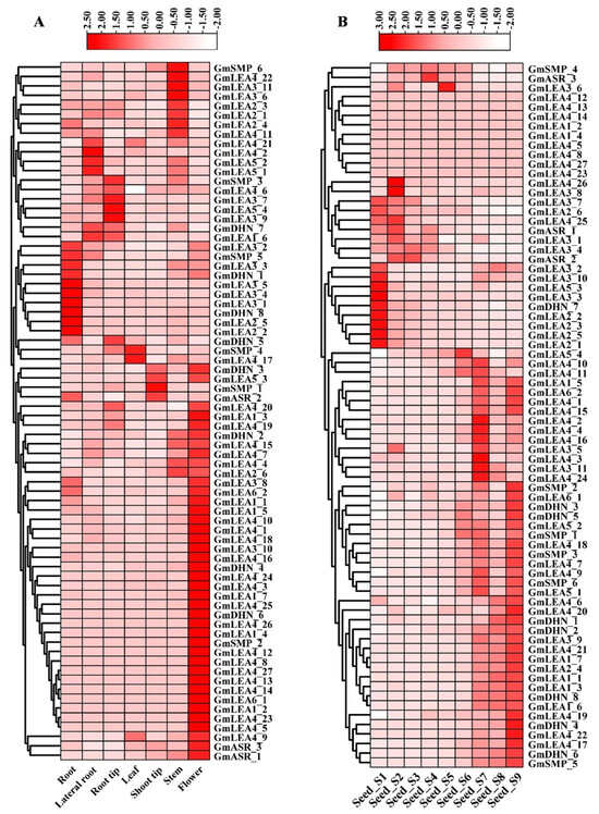 Heatmap and clustering diagram of GmLEA gene expression in different tissues based on normalized row scale method. (A) and seed stage of development (B). Rows represent GmLEA members, while columns show different developmental stages and tissues. Blocks with the intensity of colors indicate decreased (white) or increased (red) transcript accumulation.