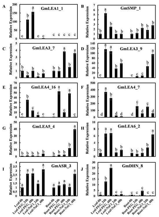 qRT-PCR expression patterns of ten GmLEA genes under salt and PEG6000 treatments. The time points represented by x-axis and the scale of relative expression shown by y-axis. Within the figure, columns with different letters are significantly different (from a Tukey–Kramer HSD P, 0.01). (A–J) The relative expression levels of ten GmLEA genes revealed by qPCR.