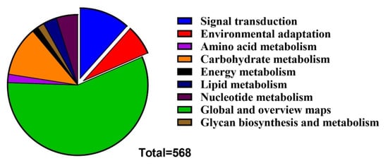 All GmLEA genes were selected for the co-expression-based gene network analysis. Co-expressed genes with Spearman correlation coefficients were selected as relevant genes from the RNA-Seq data. A total of 3196 genes were selected based on a p-value < 0.05. Finally, 568 genes with significant enrichment in the different pathways were identified. The Kyoto Encyclopedia of Genes and Genomes (KEGG) enrichment analysis revealed that the metabolism-related pathways were enriched in these co-expressed genes, including amino acid metabolism, carbohydrate metabolism, energy metabolism, global and overview maps, glycan biosynthesis and metabolism, lipid metabolism, and nucleotide metabolism (Figure 8). For signal transduction, it mainly involved the signal transduction pathways of plant hormones. Environmental adaptation mainly involved the plant-pathogen interaction pathways. Those results suggest that soybean LEA proteins may exert regulatory effects on those metabolic pathways.