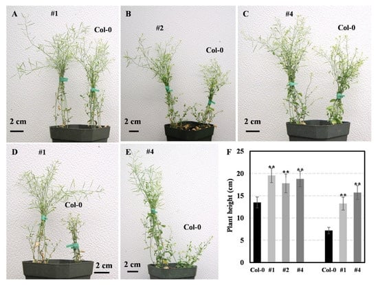 To explore the functions of GmLEA, three independent Arabidopsis transgenic lines (ABRE3:GmLEA4_19_#1, ABRE3:GmLEA4_19_#2, and ABRE3:GmLEA4_19_#4) were generated and used to conduct drought assays. Under a mild drought condition, the plant height in transgenic plants was significantly higher than wild plants (Figure 9A–C). Under a serious drought condition, the average height of transgenic plants is twice that of wild-type plants (Figure 9D–F). Moreover, the seed setting rate of the wild-type significantly decreased, but some pods of the transgenic plants were still able to grow normally (Figure 9D,E).