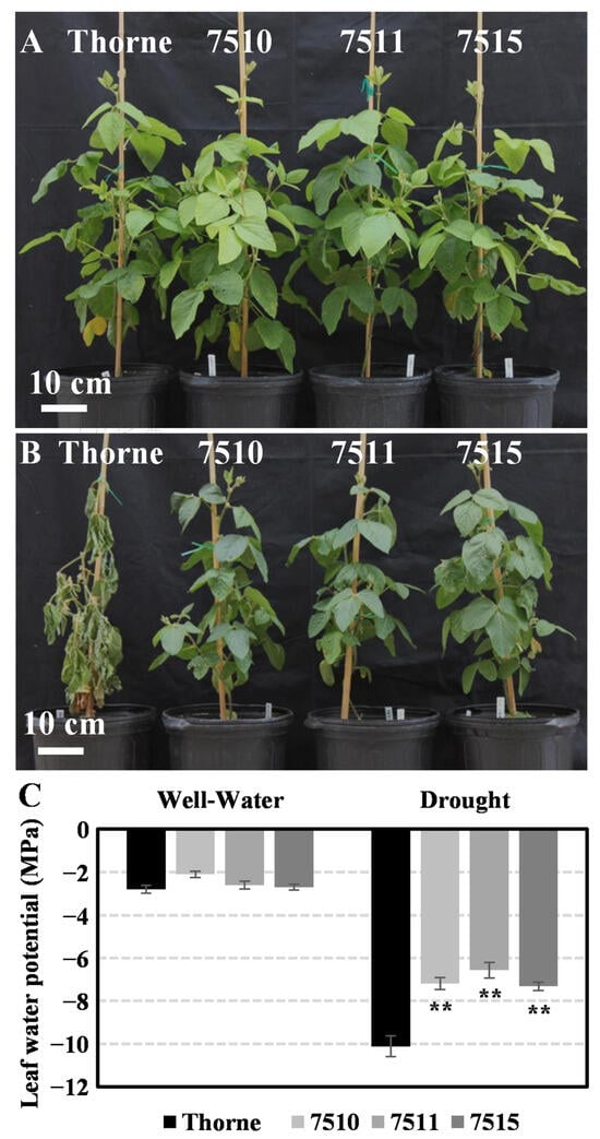 Overexpressed GmLEA4_19 transgenic soybean showed drought tolerance phenotype. (A) Transgenic plants growing in the greenhouse under well-watered condition; (B) transgenic plants growing in the greenhouse after withholding water for 21 days; and (C) leaf water potential was determined under well water and drought conditions. Means and standard deviations were obtained from three biological replicates. Asterisks represent statistically significant differences between wild-type and transgenic lines under the same treatment. **, p < 0.05.