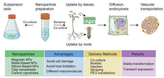 Nanotechnology has been applied in agriculture such as nanosensors [11], nanopesticides [12], and nanofertilizers [13], and this has led to considerable interest in recent studies. Indeed, nanoparticle-mediated gene transformation has been extensively used for gene delivery in plants. As such, nanoparticles—particles of small sizes (1–100 nm) with tunable physical and chemical properties [14]—could be served as an effective vector to transport cargos to bypass the cell wall and the plasma membrane. In particular, the transit of molecular biology cargos such as DNA, RNA, and proteins to plant cells has become increasingly imperative [7,14]. Hence, nanoparticle-mediated biomolecule delivery would be a potential approach to overcome the drawbacks of conventional biomolecule delivery methods, improving transformation efficiencies in agricultural plant biotechnology. Here, we review the different methods used for plant transgenics, and emphasized the advantages in application of nanotechnology from the development of nanocarriers for plant genetic material delivery to nano-mediated plant regeneration. We also highlight the advance of nanotechnology in gene editing, and discuss the safety issues and potential threats for nanotechnology manipulation on plant transformation in the future.