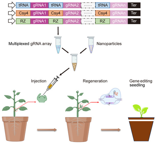 Schematic representation of a promising plant transformation method integrating genome editing, nanotechnology and de novo regeneration. Assembly of multiple guide RNAs (gRNAs) into a CRISPR vector, then transferred into intact plant meristem, resulting in tissue culture-independent transgenic plants. Adapted from [9,104].
