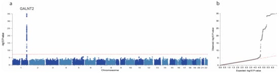 Manhattan and QQ plot of apo-CIII0a genome-wide association study (GWAS). GWAS of apo-CIII0a showing associations with alleles at the GALNT2 locus on chromosome 1. Manhattan plot (a) showing significance of the association of each single nucleotide polymorphism (SNP) allele with apo-CIII0a by plotting the -log10 of the p-Value against the genomic position. The horizontal red dotted line corresponds to the genome-wide significance threshold of p = 5 × 10−8. Quantile–quantile plot (b) is a plot of the observed -log10(p) against the expected -log10(p) under the null hypothesis of no association. Deviation above the red dotted y = x line indicates lower p-Values that would be expected to occur by chance and implies statistically significant association.