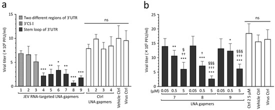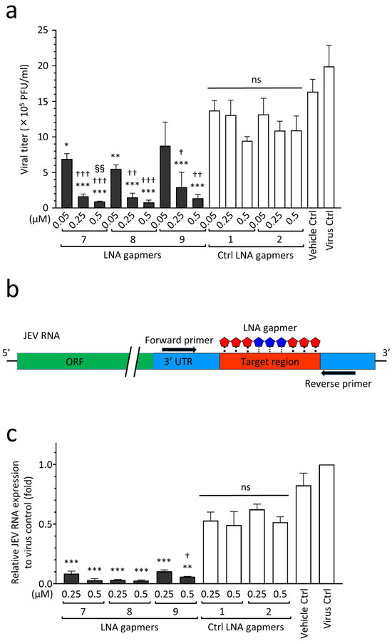 Inhibitory effect of JEV RNA-targeted LNA gapmers on JEV proliferation in Vero cells. (a) In vitro screening of designed LNA gapmers targeting the 3′ UTR of JEV RNA, as represented by plaque assay (PFU/mL). Vero cells were infected with JEV JaGAr 01 at 0.1 MOI and transfected with LNA gapmers at the concentration of 5 µM using a vehicle, Lipofectamine RNAiMAX (see Figure S1 for the scheme). Data represent mean and standard deviation (SD) from three independent experiments. The statistical analysis using logarithmic values was performed by one-way ANOVA followed by Tukey–Kramer multiple comparison test: * p < 0.05, ** p < 0.01, *** p < 0.001 vs. four control (Ctrl) LNA gapmers; ns, no significant difference. (b) Dose-dependent effect of the LNA gapmers targeting the stem-loop region as measured by plaque assay. Vero cells infected with JEV at 0.05 MOI were transfected with LNA gapmers 7, 8, and 9 at the indicated concentrations. Data represent mean and SD from six independent experiments. * p < 0.05, ** p < 0.01, *** p < 0.001 vs. ctrl LNA gapmer 2 at 5 µM. † p < 0.05, †† p < 0.01, ††† p < 0.001 vs. 0.05 µM in the same LNA gapmer. § p < 0.05, §§§ p < 0.001 vs. 0.5 µM in the same LNA gapmer.