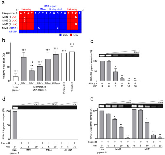 RNase H-mediated antiviral mechanism of JEV RNA-targeted LNA gapmers measured by cell-based and biochemical RNA cleavage assays using mismatched (MM) LNA gapmers. (a) MM LNA gapmer sequences used for the experiment. The mismatched nucleotides are shown as white letters compared to the original LNA gapmer 8. The red and blue squares indicate LNA and DNA, respectively. MM1, MM2, and MM3 contain two or one mismatched nucleotides in LNA wings. MM4 has two mismatched nucleotides in the RNase H-binding DNA region. All DNA has no LNA. (b) Attenuated inhibitory effect of MM LNA gapmers on JEV proliferation in Vero cells as represented by plaque assay. Vero cells infected with JEV JaGAr 01 at 0.05 MOI were treated with LNA gapmers at the concentration of 5 µM, and the viral titers (PFU/mL) were measured by plaque assay. Data represent mean and SD from four independent experiments. The result is shown as the percentage; vehicle control was defined as 100%. The statistical analysis using logarithmic values was performed by one-way ANOVA followed by Tukey–Kramer multiple comparison test: ** p < 0.01, *** p < 0.001 vs. virus control. †† p < 0.01, ††† p < 0.001 vs. LNA gapmer 8. (c) RNase H-mediated degradation of synthetic JEV RNA bound to LNA gapmer 8 over time as represented by RNA cleavage assay. A representative band image of the synthetic JEV RNA and LNA gapmer complexes is shown above the graph (an uncropped image is available in Figure S3c). The negative control of RNase H (-) is considered as 100%. The graphs calculated with band intensities represent the mean and SD of three independent experiments. The results with LNA gapmers 7 and 9 and the uncropped images are available in Figure S2. (d,e) The impairment of sequence-specific degradation activity to JEV RNA by a few mismatched nucleotides in an LNA gapmer as represented by RNA cleavage assay: (d) the loss of binding ability to the target RNA by double mismatches or no LNA in an ASO and (e) the decreased ability to degrade the JEV RNA sequence by a single mismatch. The graphs with band intensities are represented as the percentage of 0 min in the absence of RNase H, defined as 100% (mean, SD of n = 3 in each). Shirley–Williams test was performed for statistical analysis: * p < 0.05, ** p < 0.01 vs. 0 min just after the RNase H addition.