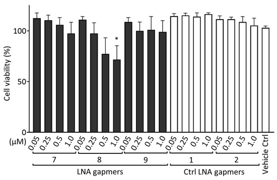 To evaluate the cytotoxicity of LNA gapmers in human neuroblastoma SK-N-SH cells, we measured the cell viability after transfection with LNA gapmers (Figure 5). SK-N-SH cells were treated using LNA gapmers with an identical procedure to that conducted for Figure 4; the cells were incubated with a medium containing LNA gapmers at different concentrations of 0.05 to 1 µM and a vehicle of Lipofectamine RNAiMAX for four hours, and then with a maintenance medium without the agents until the measurement of cell viability using the Cell Counting Kit-8 (CCK-8; Dojindo Laboratories, Kumamoto, Japan). Compared to the vehicle control, three LNA gapmers at all concentrations tested, except for LNA gapmer 8 at one µM (approximately 70%), did not significantly reduce the cell viability. In the cell-based evaluation, as shown in Figure 4, SK-N-SH cells were treated with LNA gapmers at the range from 0.05 to 0.5 µM, at which apparent cytotoxicity was undetectable in the CCK-8 assay. The CCK-8 assay result observed here supports that the reduction in viral titer by LNA gapmer treatment is not due to cell decrease caused by the cytotoxicity of LNA gapmers.