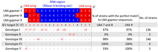 A total of 292 JEV RNA sequences that LNA gapmers 7, 8, and 9 target were collected using ViPR (http://www.viprbrc.org/ accessed on 2 May 2022) and from the four JEV strains determined in this study (J-8-170-B, J-8-194-S, Mie44-1, and AS6). They were composed of 136, 3, 146, 4, and 3 strains of the five genotypes I to V, respectively. The conservation of the JEV RNA sequences complementary to the LNA gapmers was analyzed using Clustal Omega (https://www.ebi.ac.uk/Tools/msa/clustalo/ accessed on 2 May 2022).