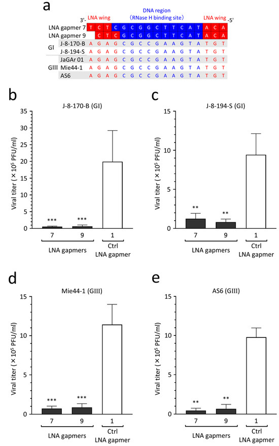 JEV genotypes I and III are currently predominant in Asia [34]. To validate the potential applicability of our LNA gapmers to different JEV wild-type strains, as predicted above, we empirically tested the inhibitory effect on the proliferation of two genotype I strains (J-8-170-B and J-8-194-S) and two genotype III strains (Mie44-1 and AS6). We confirmed the strains’ genotypes by sequencing the envelope protein-encoding gene following the determination of sequence conservation of the LNA gapmer target region in the four wild-type strains (Figure 7a). Based on the target sequence conservation, we analyzed the antiviral efficacy of LNA gapmers 7 and 9, which had lower toxicity (Figure 5), against the four JEV wild-type strains in human neuroblastoma cells (Figure 7b–e). We observed an encouraging result, namely that compared to a control LNA gapmer (mean 9.4 × 105–1.9 × 106 PFU/mL), LNA gapmers 7 and 9 at 0.5 µM significantly inhibited the proliferation of all four wild-type strains (mean 4.5 × 104–1.2 × 105 PFU/mL), regardless of the genotype difference.