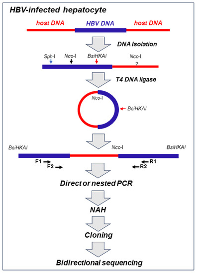 Schematic step-by-step outline of methods used for the detection of HBV integration and the identification of the sequences acting as the host’s HBV insertional sites and HBV DNA breakpoints in infected hepatocyte. Total DNA was extracted from infected cells and treated with restriction enzyme NcoI, which cut HBV DNA at the single site and the HBV-merged host’s sequence at unknown sites. The resulting hybrid DNA fragments were circularized with T4 DNA ligase and then linearized with BsiHKAI endonuclease to facilitate PCR amplification and cloning. Nested PCR was performed with forward (F1 and F2) and reverse (R1 and R2) primers. The exception was a situation in which a particular band was well identifiable after direct PCR by agarose gel electrophoresis and clearly displayed the HBV signal with nucleic acid hybridization (NAH). NAH was routinely used to verify the presence of HBV sequences and to augment the detection of the HBV–host DNA merges even when the bands carrying the merges were not apparent on the gels. This was followed by the cloning of HBV-positive amplicons and bidirectional sequencing of the clones. The aim was to sequence 20–30 clones from each band analyzed. For more information, see the text and references [19,31,32]. For identification of WHV–host DNA merges, the approach used was identical to that above, but restriction enzymes and PCR primers were specific for WHV, as reported in [19,31].