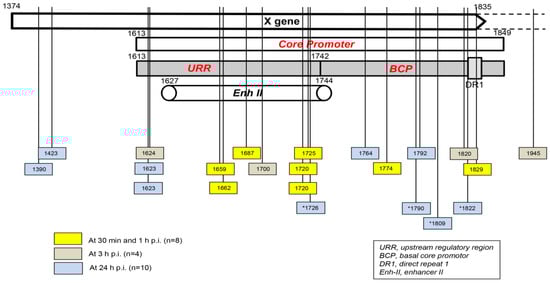Schematic presentation of the HBV X gene break points forming fusions with the human genomic sequences that were detected in hepatocyte-compatible HepRG and HepG2-NRCP-C4 cells within the first 24 h after exposure to HBV. Yellow squares show breakpoints that formed junctions detected at 30 min and 1 h after exposure to virus, red squares show those identified at 3 h post-infection, and blue squares show those detected at 24 h post-infection. Blue squares with stars show breakpoints reported at 24 h after infection in reference [36]. Numbers mark nucleotide positions according to the HBV DNA GenBank X79185 sequence. Abbreviations: URR, upstream regulatory region of the HBV core promoter; BCP, basal core promoter; DR1, direct repeat region; Enh II, HBV enhancer II.