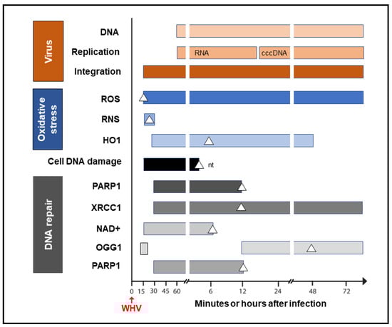 Together, the time of the first hepadnavirus DNA integration into the hepatocellular genome was identical in human HepaRG cells exposed to HBV and in woodchucks infected with WHV. Regarding the replication of HBV and WHV, it was detected from 1 h p.i. in both infection systems [31].
