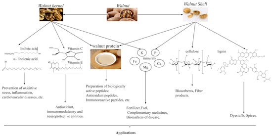 Walnuts, as a traditional plant, are one of the most important economic forest products in the world, particularly in China. According to the FAO data, from 2017 to 2021, the global walnut harvest area and yield steadily increased, with year-on-year growth rates of 2.87% and 1.59%, respectively. In 2021, the walnut harvest area and yield of China accounted for 24.6% and 31.42% of the world’s total, respectively, thus making China the leading country in global walnut production. As shown in Figure 1, walnut kernels are rich in unsaturated fatty acids, proteins, vitamins, and minerals [6,7], which have important biological activities such as antioxidant [8], antitumor [9], anti-inflammatory [10,11], anti-hypertensive [12] and anti-cardiovascular disease activities. Walnut kernels have a high fat content (52–70%), and these fats can be processed into walnut oil [13]. Walnut oil is rich in unsaturated fatty acids and is favored by people because of its nutritional benefits [14]. In recent years, the increase in market demand for walnut oil has led to an increase in walnut residue, a byproduct of walnut oil. Walnut residue contains approximately 40–45% proteins, which are rich in 18 amino acids, including the eight essential amino acids for the human body, thus making walnut residue a high-quality plant protein resource [13,15]. Therefore, research on walnut proteins is valuable and potentially useful for developing functional products with health benefits.