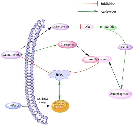 Oxidative stress often leads to Aβ accumulation by inducing ROS production and mitochondrial morphological and functional damage, eventually leading to brain neurotoxicity. Autophagy can suppress neurotoxicity by inhibiting ROS production [66]. The Akt/mTOR signaling pathway, a typical autophagy regulatory pathway, can modulate the expression of LC3-I and p62 proteins by regulating PTEN, p-Akt, and p-mTOR and attenuating the activity of MDA and SOD [67]. Zhao et al. investigated the novel peptides TWLPLPR, YVLLPSPK, and KVPPLLY that inhibit ROS production [64]. Western blotting assay and immunofluorescence assay revealed that these peptides could regulate the Akt/mTOR signaling pathway through p-Akt (Ser473) and p-mTOR (S2481), thereby reducing LC3-II/LC3-I and Beclin-1 levels by increasing p62 expression to promote autophagy. These peptides increased the levels of LAMP1, LAMP2, and histone D and promoted fusion with lysosomes to form autophagic lysosomes, thereby accelerating ROS removal. The results demonstrate that walnut-derived peptides regulate oxidative stress through autophagy mediated by the Akt/mTOR signaling pathway (Figure 3).