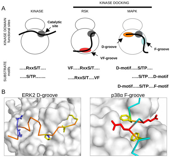 Protein kinases themselves are also regulated by reversible phosphorylation and this relies on protein–protein binding between kinases and their regulators (e.g., upstream kinases, phosphatases, or scaffolds), moreover, efficient phosphorylation of some of the downstream substrates requires additional protein–protein contacts which are distinct from those mediated by the universal substrate-binding pocket located next to the catalytic site/nucleotide-binding pocket. Apart from the enzymatic properties and the capacity to form the catalytic Michaelis–Menten complex, the cellular function and the specific roles of protein kinases are thus also governed by their protein–protein interactions (PPIs). This mechanism is generally referred to as kinase docking and it is common among Ser/Thr kinases [9]. Docking increases the specificity of target site phosphorylation: it involves a dedicated PPI surface on the kinase domain (namely the docking groove) and a linear binding motif sequence from the partner (namely the docking motif) [10]. The docking motif is normally located in a disordered region and contains a set of amino acids fitting into the docking groove upon binding. Docking motifs facilitate the phosphorylation of functionally important phosphorylation target sites by enhanced proximity [11,12]. The binding affinity between the kinase-docking groove and the docking motif is in the low to medium micromolar range [13,14]. In summary, kinase-docking grooves expedite more selective phosphorylation of substrates, while they are also engaged in binding to upstream kinases and/or to phosphatases [15].