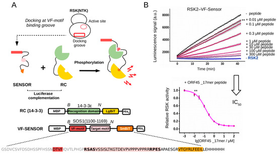 Principle of the PhALC assay and its validation on RSK-docking-motif-mediated binding. (A) The sensor construct contains the SOS1(1100–1166) region that harbors the VF-motifs and the RxxS/T target sites (VF-Sensor). The latter is bound by the recognition construct (RC) upon phosphorylation. The RC harbors a phosphoserine/-threonine-binding 14-3-3ε domain and the phosphorylation-dependent interaction between the VF-Sensor and RC will facilitate the formation of active luciferase. (The VF-Sensor and the RC are tagged with SmBit and LgBiT fragments of the NanoBiT luciferase, respectively, and also contain N- and C-terminal affinity tags for fast purification; MBP—maltose binding protein, His6—hexahistidine tag). The VF-Sensor and the RC were used in 1 μM and 0.5 μM concentrations, full-length active RSK2 was used in 20 nM concentration and the reaction was started by the addition of ATP. (B) Panels show that the kinetic rate of the luminescence signal correlated with the degree of VF-Sensor phosphorylation by RSK. A VF-motif-containing peptide added in trans competed for binding with the VF-Sensor and thus decreased the rate of the luminescence signal (upper panel). RSK activity was compared to the rate of the reaction containing no peptide (−peptide; the panel shows the raw kinetic luminescence signal; a.u. artificial units; −RSK2: no kinase added). The IC50 value of peptides can be determined when relative RSK activity is plotted as the function of peptide concentration added in trans (lower panel showing the results obtained with ORF45_17mer peptide). Error bars show SD based on three measurements. (B and N denote BamHI and NotI cloning sites with which the functional elements of the sensor and the RC could be modified in the DNA expression plasmids.) Asterisks, here shown only for the lowest concentration of the competitor peptide compared to “−peptide”, indicate results of a two-sided, unpaired t-test (**: p < 0.01).