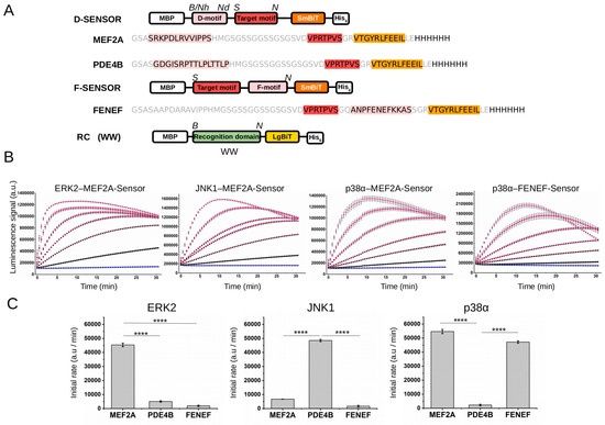 Similar to what was described earlier with the RSK Sensor, to be able to monitor kinase docking for MAPKs, the NanoBit luciferase fragment complementation-based PPI assay concept was modified so that MAPK-docking-mediated phosphorylation of an artificial substrate sensor could also be monitored in a microplate reader. Briefly, a general MAPK phosphorylation target motif (S/TP) was positioned C-terminal from an MAPK-binding D-motif, or N-terminal from an F-motif, and this SENSOR construct was fused with the small fragment of the luciferase enzyme. In the recognition construct (RC), a WW domain binding specifically to the phosphorylated MAPK target motif was fused with the large fragment of the luciferase [40]. We made two different D-Sensors containing different D-motifs: a short MEF2A D-motif-containing peptide was earlier shown to bind both to ERK2 and p38α, while the PDE4B motif binds only to JNKs (MEF2A-Sensor and PDE4B-Sensor) [13,15]. In addition, an F-groove binding short peptide from ATF2 known to specifically bind to phosphorylated p38α was used in the F-Sensor (henceforth referred to as the FENEF-Sensor) [29] (Figure 3A).