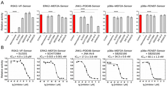Apart from kinase docking, the PhALC assay may also be used as a general kinase-activity reporter system. To this end, we tested the effect of six different ATP-competitive inhibitors: staurosporin, SL0101 (RSK NTK inhibitor), SCH772984 (ERK inhibitor), SB202190 (p38 inhibitor), JNK-IN-8 (a highly selective JNK inhibitor), and SP600125 (another widely used JNK inhibitor) in 10 μM concentration in all five newly developed PhALC assays (RSK2–VF-Sensor, ERK2–MEF2A-Sensor, JNK1–PDE4B-Sensor, p38α–MEF2A-Sensor, and p38α–FENEF-Sensor) [41,42,43,44,45] (Figure 4A). This showed that staurosporin efficiently blocked RSK, but the activity of MAPKs was unaffected with this inhibitor and SCH772984 and SB202190 blocked ERK2 and p38α, respectively, while both JNK inhibitors had the strongest effect on JNK1. This matches the expected inhibitory profile of the tested drugs. Next, we used the PhALC assay and determined the in vitro IC50 of SL0101 on RSK, SCH772984 on ERK2, and JNK-IN-8 on JNK1, which all gave values matching those that had been determined earlier for these kinases by other methods: RSK2/SL0101, 4 μM; ERK2/SCH772984, 0.015 nM; and JNK1/JNK-IN-8, 17 nM [41,42,44]. Moreover, for the p38-specific inhibitor (SB202109) assays with both the MEF2A-Sensor or the FENEF-Sensor gave similar values (34 and 60 nM, respectively), as expected (Figure 4B).