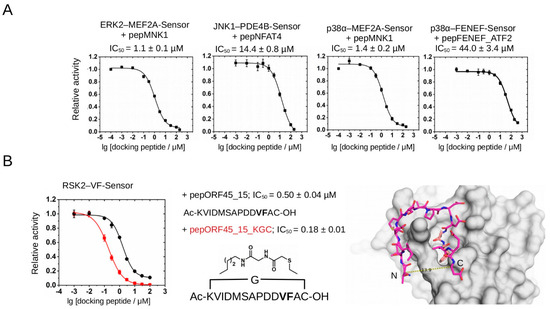 Finally, we validated all five assays by using chemically synthesized D-, F-, or VF-motif containing peptides, which were added in trans (Figure 5A). These experiments showed that IC50 values determined this way showed an excellent agreement with the binding affinity of docking peptides or with other independent measurements: ERK2/pepMNK1 PhALC(IC50) = 1.1 μM vs. 1.2 μM binding affinity of pepMNK1 to ERK2; JNK1/pepNFAT4 PhALC(IC50) = 14.4 μM vs. 7.1 μM binding affinity of pepNFAT4 to JNK1; p38α/pepMNK1: PhALC(IC50) = 1.4 μM vs. 0.4 μM binding affinity of pepMNK1 to p38α [13]; p38α/FENEF PhALC(IC50) = 44 μM vs. ~30 μM IC50 determined earlier in a Western-blot-based assay [29]; and RSK2/ORF45 _15 PhALC(IC50) = 0.5 μM vs. 2 μM binding affinity for an ORF45 peptide similar in length binding to RSK NTK [18]. Moreover, a newly synthesized cyclic version of the ORF45 VF-motif peptide displayed a close to three-fold lower IC50 value compared to the linear version, suggesting that cyclization may create a more rigid structure well-suited to adopting an optimal binding conformation in the docking groove—as the artificial covalent link between the N- and C-terminal amino acids had been designed based on the crystal structure of the RSK(NTK)-pepORF45 crystallographic complex [18] (Figure 5B).