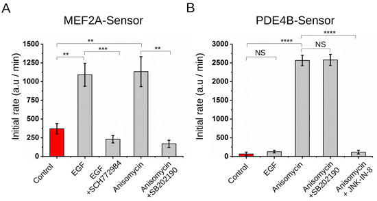 Application of the PhALC assay in HEK293T cell lysates. Summary of PhALC measurements with (A) MEF2A-Sensor and (B) PDE4B-Sensor using EGF-treated or anisomycin-treated HEK293 cells. HEK293T cells were pre-incubated with no inhibitor (control in red) or with 10 μM inhibitor before EGF (100 ng/mL) or anisomycin (10 μg/mL) stimulation in 12-well plates. Cells were lysed and some of the lysate was added into the MEF2A-Sensor or PDE4B-Sensor containing standard PhALC assay reaction mix. The panels show the initial rate of luminescence. Note that EGF turns on ERK activity while anisomycin turns on p38 and JNK. (SCH772984 is an ERK-specific, SB202190 is a p38-specific, and JNK-IN-8 is a JNK-specific inhibitor.) Error bars show SD based on three measurements. Asterisks indicate results of a two-sided, unpaired t-test (NS: nonsignificant, **: p < 0.01, ***: p < 0.001, ****: p < 0.0001).