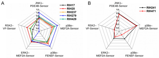 Summary of screening results with an academic compound collection. Inhibitory specificity profile of compounds that decreased the initial luminescence rate more than 70% in any of the five PhALC assays in the primary screens (see Supplementary Figure S1). (A) Panel shows this inhibitory profile for promiscuous compounds, where the axes show the degree of inhibition (0: no inhibition, 1:100% inhibition). (B) Panel shows the inhibitory profile of two, more selective compounds (RIH241 and RIH471).