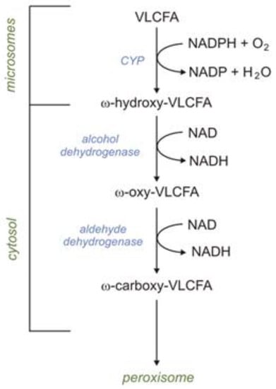 VLCFAs are also oxidized in microsomes via ω-oxidation. In humans, the first step of ω-oxidation is catalyzed by CYP (CYP4F2 or CYP4F3B). Omega-hydroxy-VLCFAs, formed by CYP4F2 or CYP4F3B, can be oxidized to ω-HOOC-VLCFA (dicarboxylic-VLCFA) by alcohol dehydrogenase and subsequently by aldehyde dehydrogenase. Formed HOOC-VLCFA is then oxidized by βOX in peroxisomes. Importantly, the βOX of HOOC-VLCFA is not affected in X-ALD (X-linked adrenoleukodystrophy) patients [2]. Thus, it has been suggested that the peroxisomal βOX of dicarboxylic-VLCFA (formed during ω-oxidation) can provide an alternative route of VLCFA oxidation in X-ALD patients (Figure 3) [2].