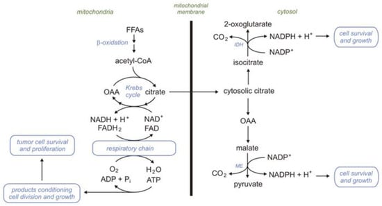 Fatty acids (FAs) are critical compounds for the health control and development of the human body due to their participation in cellular metabolism, especially energy production (ATP synthesis), metabolism regulation, and cell proliferation. They are (a) building blocks for complex lipids in cellular membranes, (b) precursors for signaling molecules, such as eicosanoids, (c) allosteric regulators of metabolic pathways, (d) substrates for protein acylation, and (e) ligands for transcription factors. FAs are also responsible for lipotoxicity and contribute to the release of proinflammatory molecules, which play an important role in many diseases. Moreover, an increase in citrate, isocitrate, and malate production associated with free fatty acid (FFA) β-oxidation (βOX) leads to increased NADPH levels in some cells. Cytosolic isocitrate dehydrogenase (which catalyzes the conversion of isocitrate in the presence of NADP to α-ketoglutarate and NADPH) and a cytosolic malic enzyme (ME) (which catalyzes the conversion of malate in the presence of NADP to pyruvate and NADPH) play an important role in NADPH homeostasis.