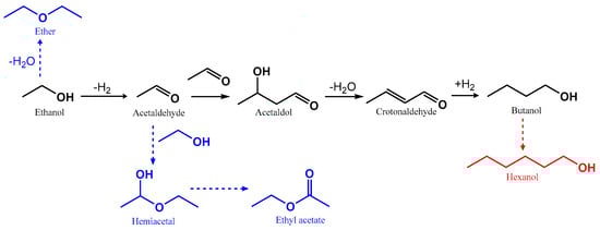 - Wu, X.; Fang, G.; Tong, Y.; Jiang, D.; Liang, Z.; Leng, W.; Liu, L.; Tu, P.; Wang, H.; Ni, J.; et al. Catalytic upgrading of ethanol to n-butanol: A progress in catalyst development. ChemSusChem 2018, 11, 71–85. [Google Scholar] [CrossRef]