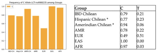Comparison of LCT-rs4988235-C allele frequency across populations. IBD-CH = IBD Chilean; Hisp-CH = Hispanic Chilean; AMR-CH = Amerindian Chilean; EUR = European; EAS = East Asian; AFR = African. * Miquel et al. [].