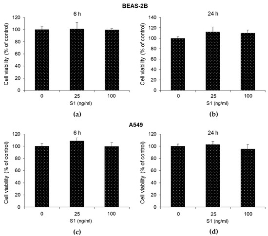 Effect of SARS-CoV-2 S1 spike protein on human bronchial BEAS-2B and alveolar A549 cell viability. Viability of (a,b) BEAS and (c,d) A549 cells, unexposed or exposed, to S1 was measured by MTT assay. Data report the means of three separate experiments carried out in triplicate, and error bars represent the standard deviation (SD) of the mean.